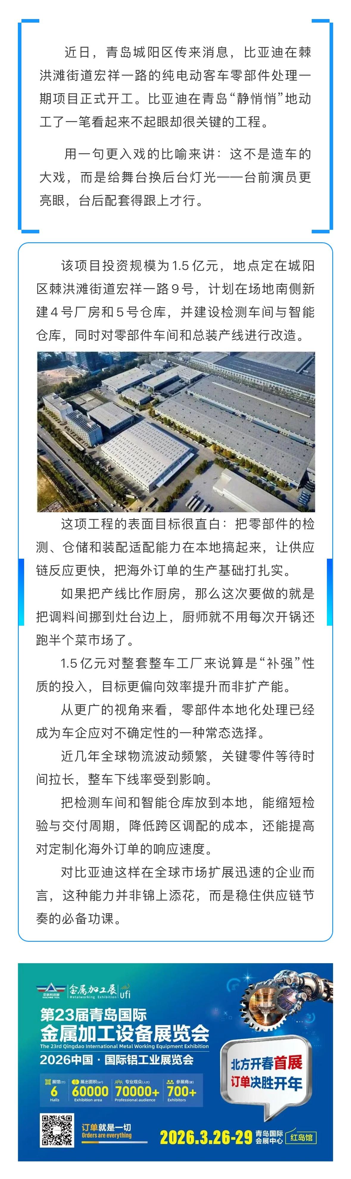 供应链提速,比亚迪青岛投下1.5亿!